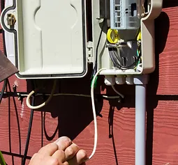 Upon customer consent, the fiber line is connected from the vault to the side of the home. This is achieved by first placing a small telecommunications box measuring 11”x 7”x 4” on the residence for the line to connect to. This is later followed by the installation of a smaller size conduit from the vault in the easement to the side of the home. A sod splitter is used to create the path for the conduit, followed by a conduit laying machine. Once the conduit is laid, fiber is run through the line to the box on the side of the home. A technician splices the line at the junction in the vault.